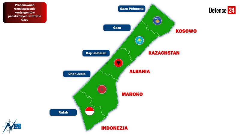 Podpis mapy:Proponowane rozmieszczenie kontyngentów państwowych w Strefie Gazy. Oprócz Indonezji w misji mają uczestniczyć również siły marokańskie, kazachskie, albańskie i kosowskie.