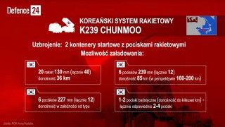 K239 Chunmoo to samobieżna kołowa wieloprowadnicowa wyrzutnia rakiet mogąca strzelać pociskami o różnym kalibrze, wprowadzana do sił zbrojnych Republiki Korei w miejsce starszych systemów K136. Przenosi dwa kontenery z pociskami rakietowymi, w każdym może mieć m.in. sześć kierowanych rakiet kalibru 239 mm o donośności około 80 km lub jeden pocisk balistyczny o donośności około 290 km. Dodajmy, że trwają prace nad nowymi pociskami do wyrzutni wieloprowadnicowych, o donośności 150-200 km, a już dziś można z nich wystrzeliwać także rakiety niekierowane w kalibrach 130 i 227 mm.